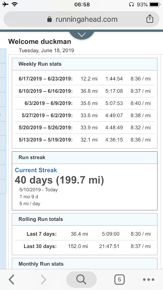 I’ve run every day since May 10th, my first day after returning from Emergency Family Leave. On some days I’ve run as short as 2 miles; others as long as 8-10. During this time I realized that my initial goals of simply building a base and getting into decent shape were too modest. It became clear to me that I had the chance to get into the best running shape of my life here. Best running shape of my adult life? Ramping up the goal gave me a new kind of motivation, and helped me think in a new way about the possibilities.