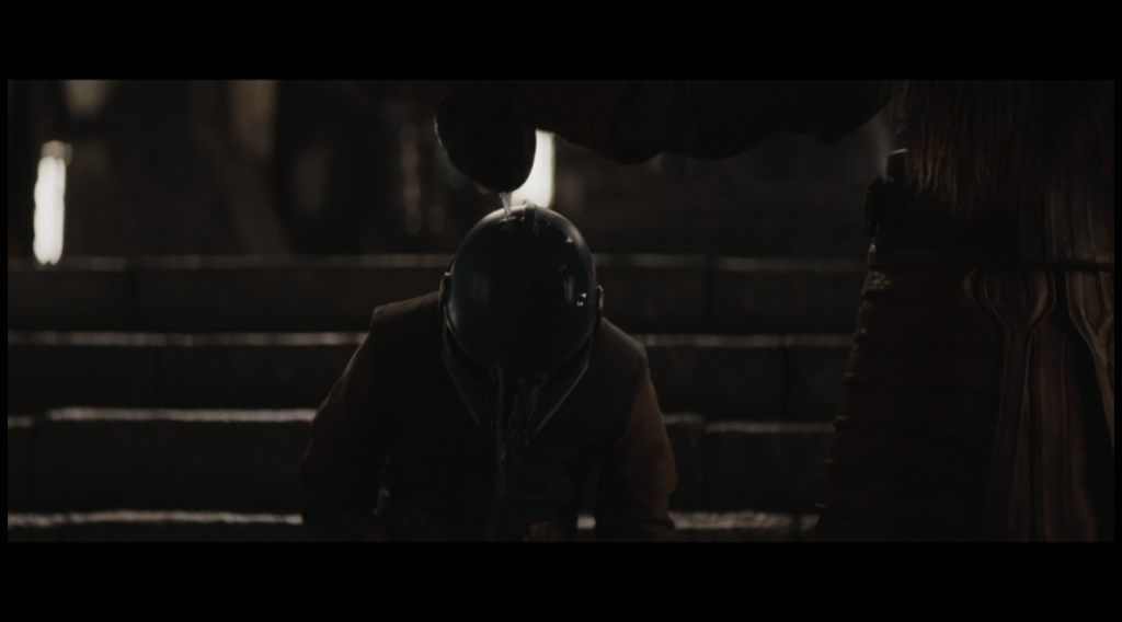 Following the completion of Ragnar’s rite of passage, Din Djarin brings Grogu to the waters to take the oath. The Armorer insists this can’t be done, as Grogu cannot speak for himself. Din Djarin then offers to adopt Grogu as his child, giving Din legal standing to speak for Grogu and to start training him as a Mandalorian. The congregation offers its assent, and the Armorer declares that it shall be “written in Song that Din Djarin is accepting this foundling as his son.” The Armorer, who acts as the community’s high priest and arbiter, gives Grogu a new name, or a second name (we’re not entirely sure how this works): Din Grogu. Just as parents speak for children in baptism, promising to raise them in a certain way of life, so too – standing at the Living Waters – did Din Djarin make a public vow to raise Grogu as his own child in the ways of the Mandalore.